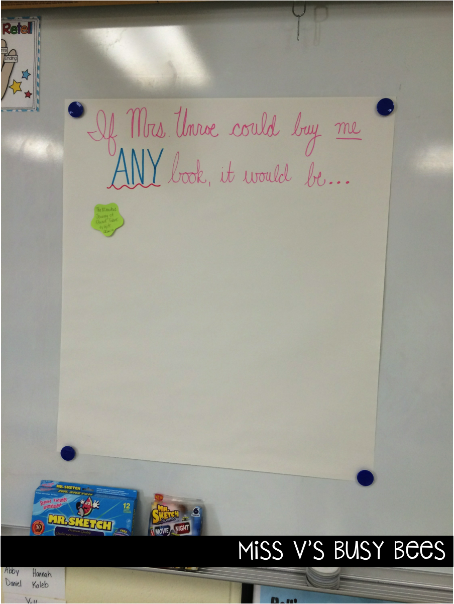 Right now, my lonely little sticky note that I used as an example is the only one up there… because we ran out of time, BUT needless to say, my students will be choosing a book that they'd like to be added to our classroom library so that they can no longer say, "I can't find anything to read, Mrs. Unroe!"
